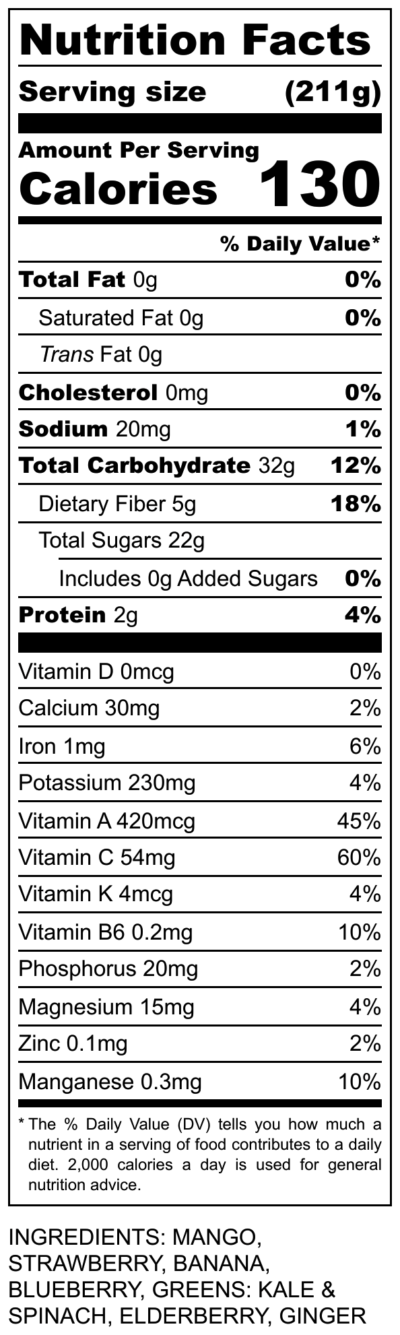 - Made with atleast 200 grams of pure fruits blended with Mango, Strawberry, Bleuberry, Banana, Greens-Kale and Spinach